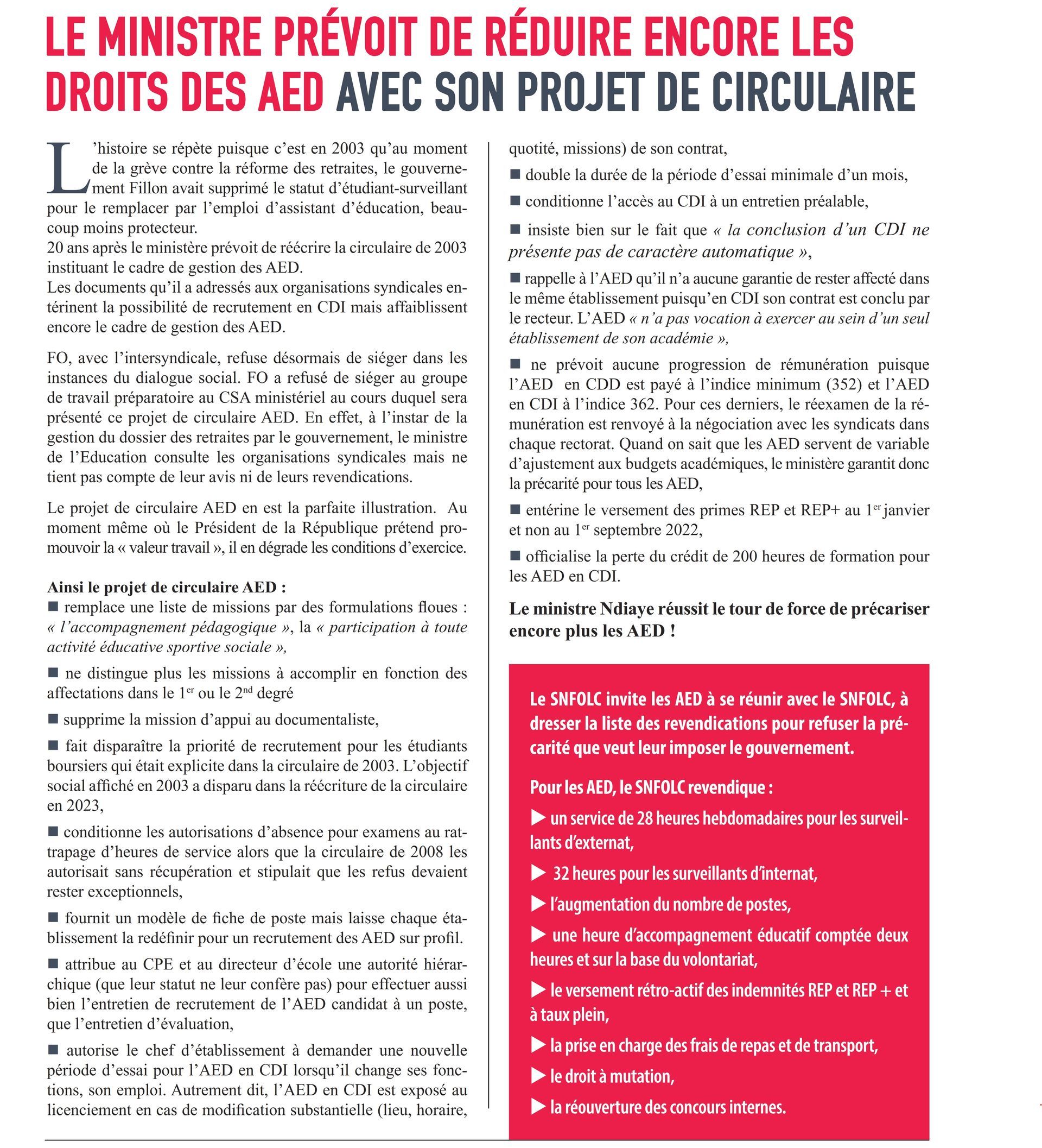 Le SNFOLC intervient au quotidien auprès des assistants d’éducation pour les défendre. Très souvent l’intervention du syndicat est décisive car l’assistance du délégué FO permet de rétablir des règles de droits et d’éviter de soumettre les AED à l’arbitraire local. Ce dossier n’a pas vocation à être exhaustif mais permet de vous conseiller à partir de situations concrètes auxquelles vous pouvez être confrontés.